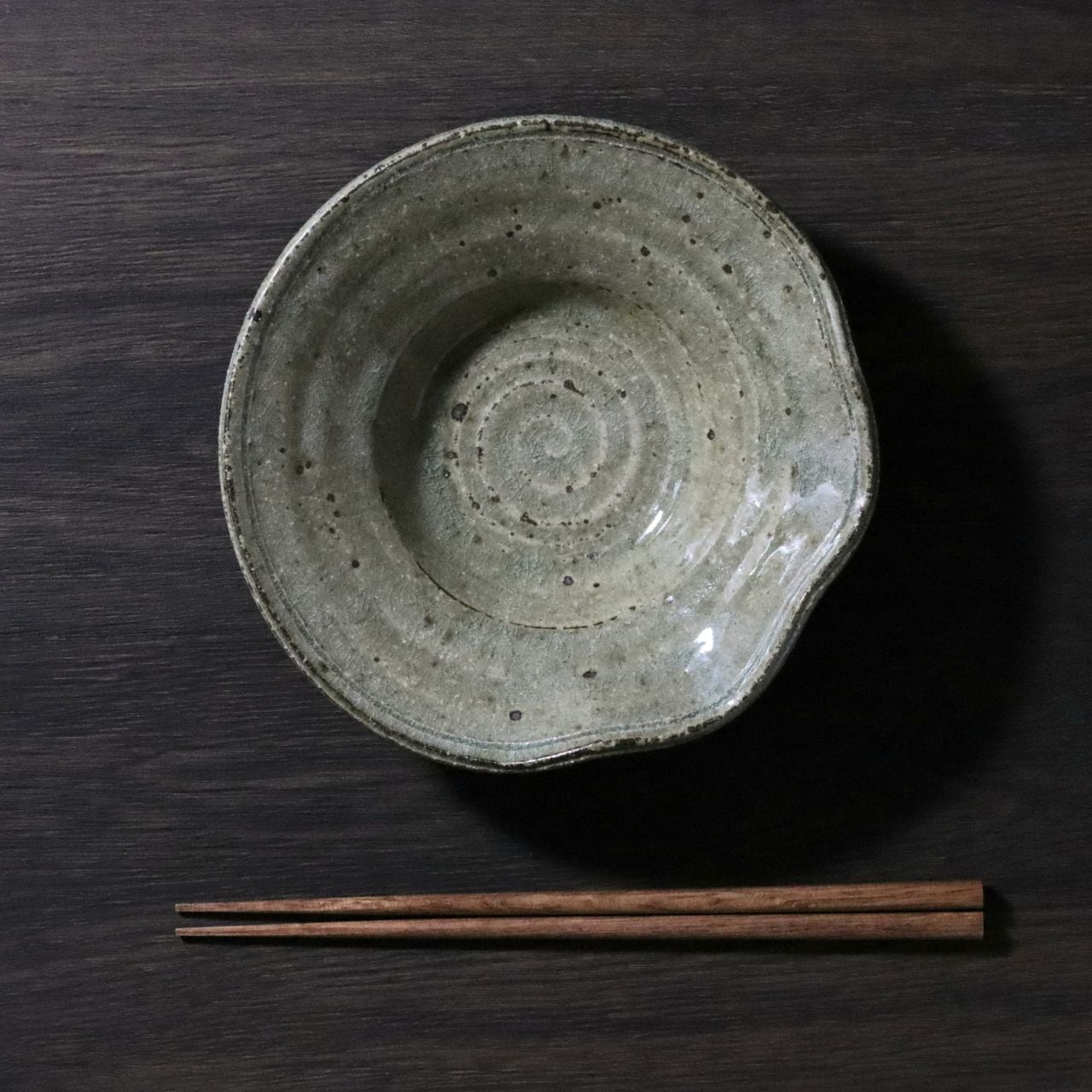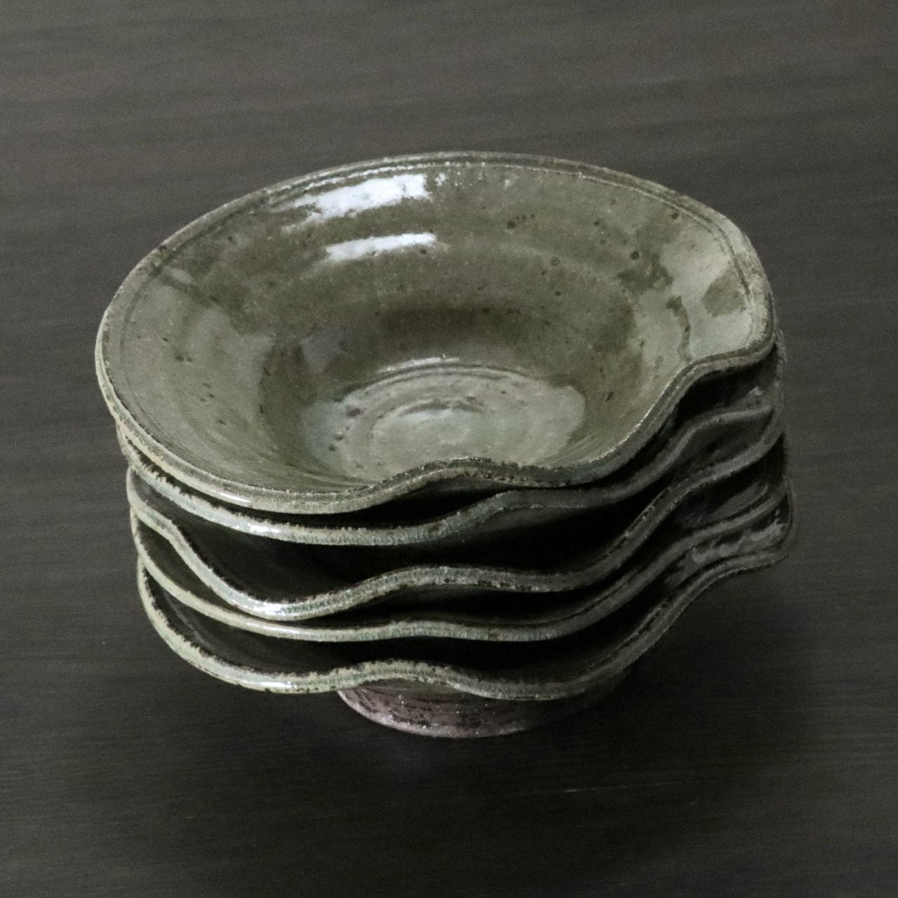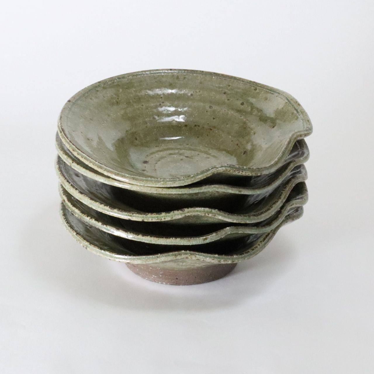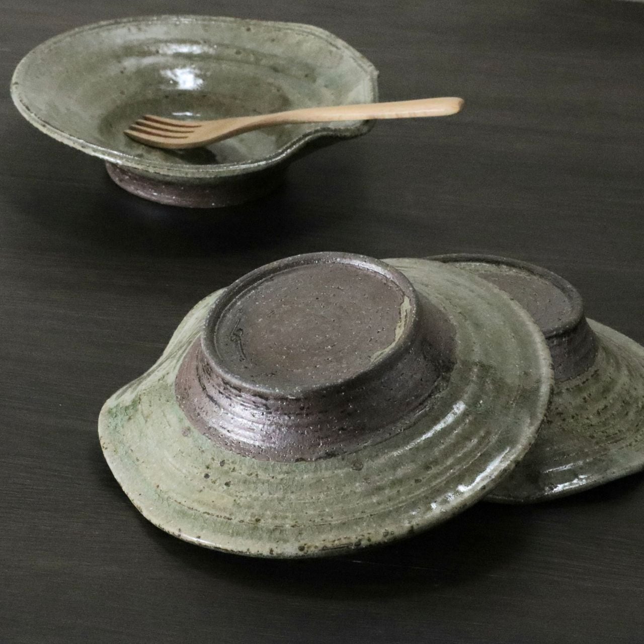 器の縁をひらひらと曲げることで、自然の美しさ、ゆらぎを表現しました。ろくろ成形での渦巻状の指後を大胆に残した動きのある造形と、天然木灰を原料に使った素朴な緑色の色合いは、お料理の姿と色彩を鮮やかに引き立てます。